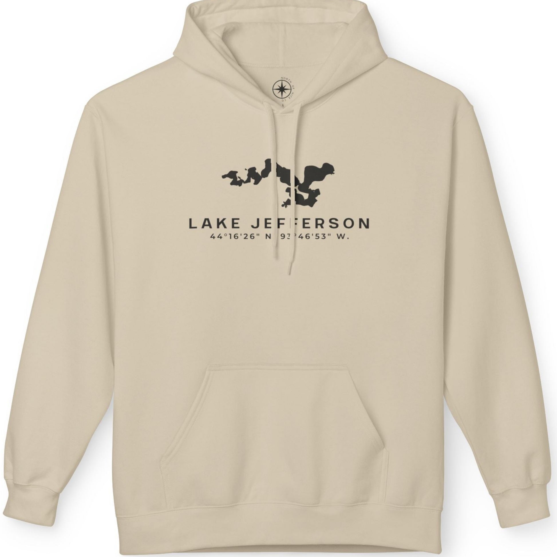 A midweight hoodie with a clean Lake Jefferson silhouette printed on the front. The fit stays relaxed, thanks to soft fabric and an easy hood, for those mornings when the lake breeze sneaks in. You throw it on for dock coffee, an early paddle, or a run to the bait shop. It layers well without feeling bulky. The simple lake graphic keeps it subtle and familiar, a little nod to the Minnesota habit of saying it is not that cold while you tighten the drawstrings anyway.