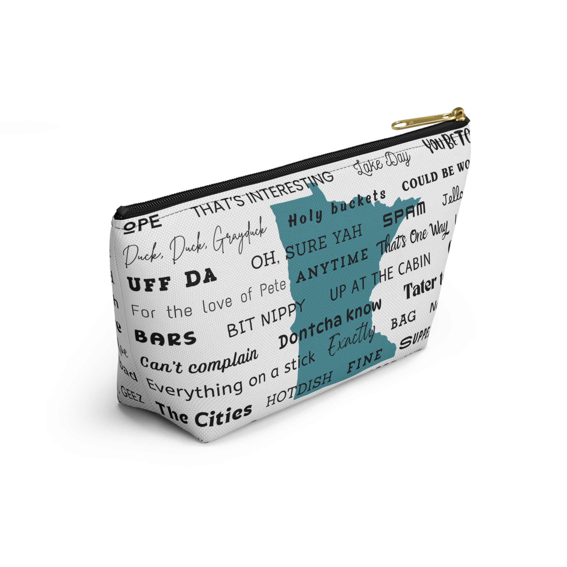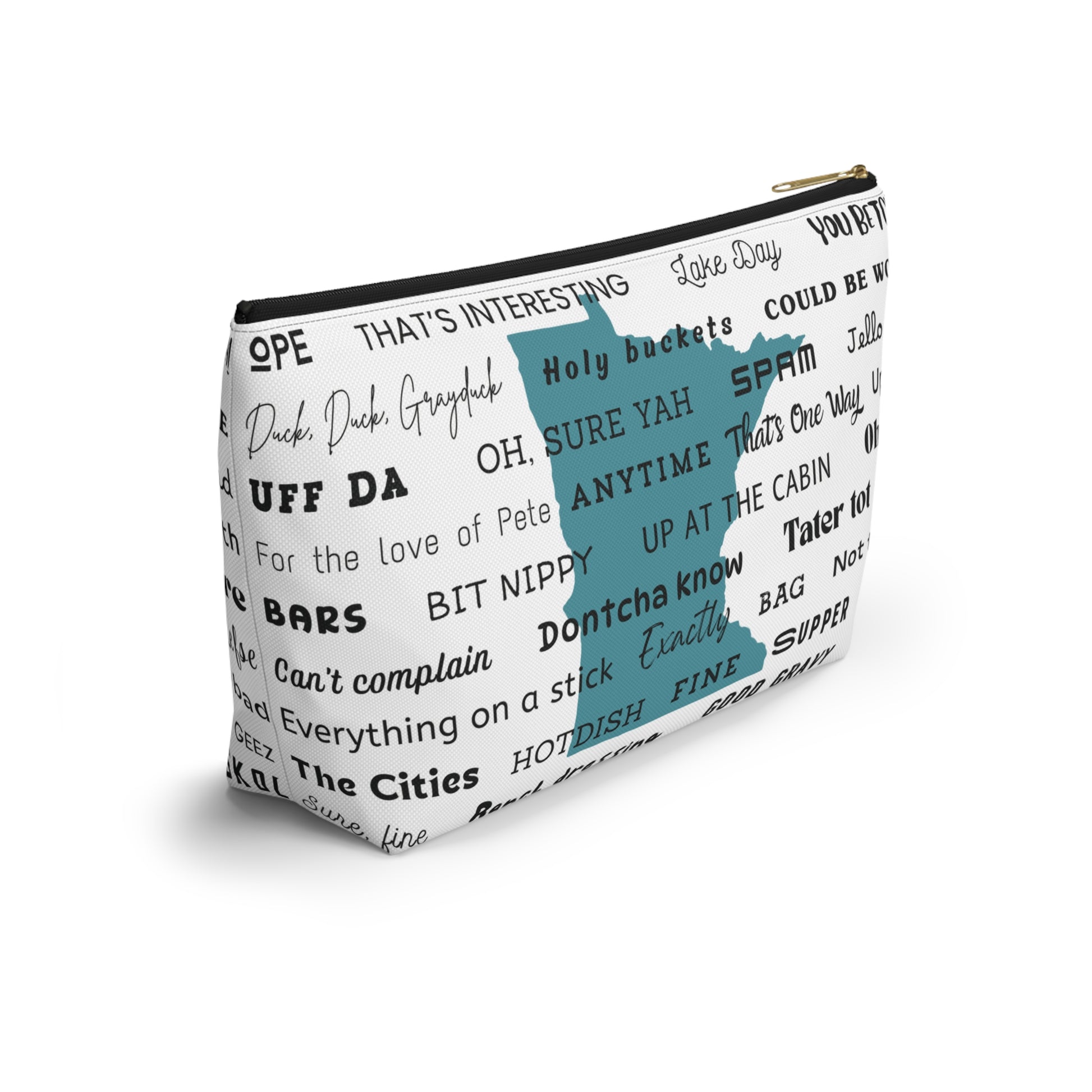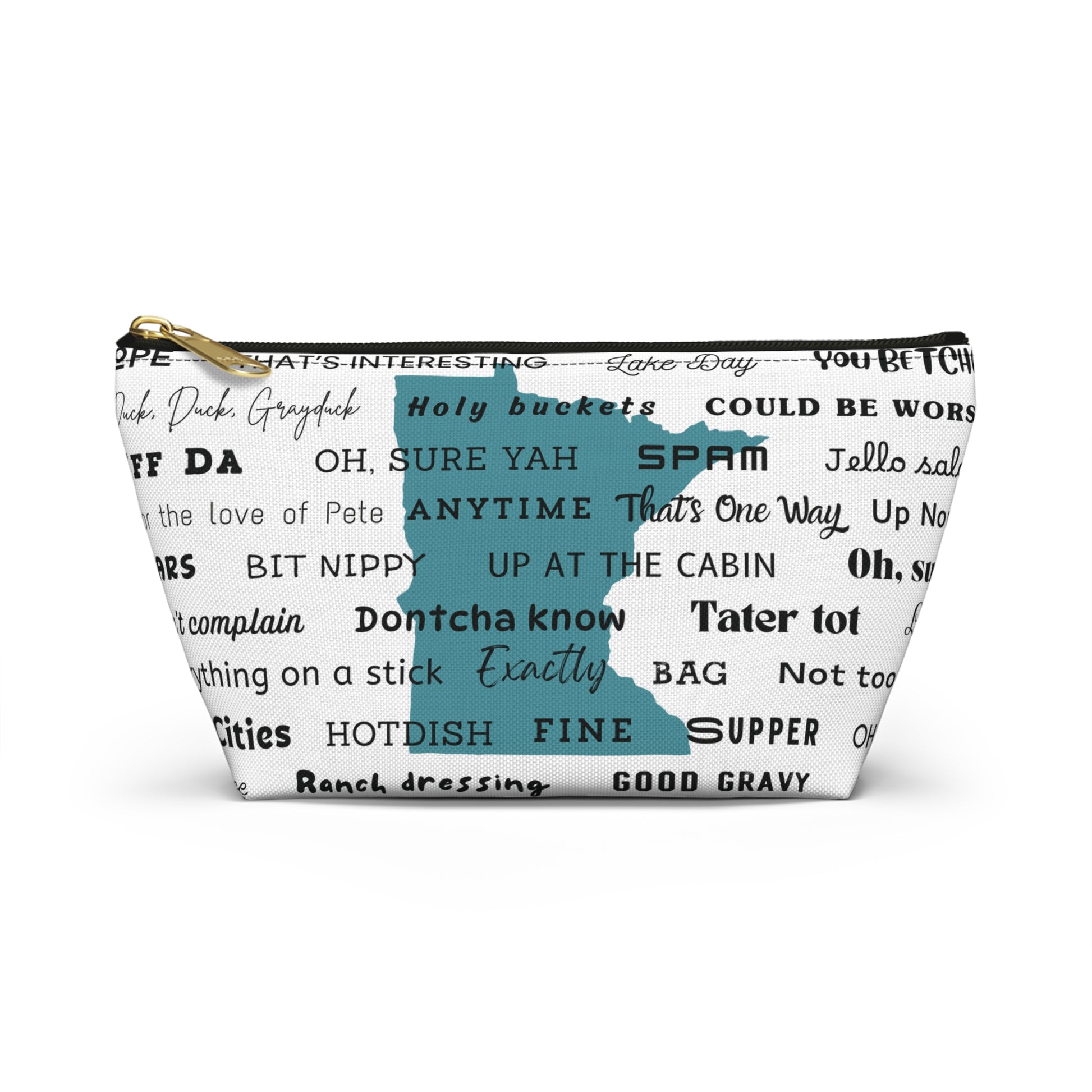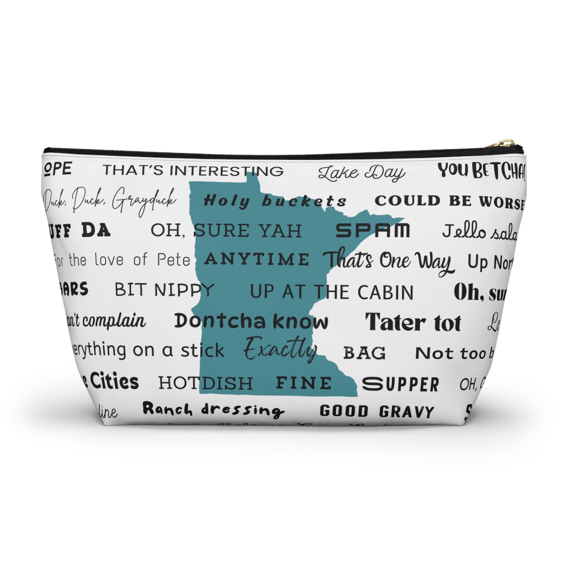 Keep your stuff together, Minnesotan style. This accessory pouch is covered in classic Minnesota slang and phrases that’ll make you smile every time you reach for it. From “Uff-da” to “You betcha,” it’s packed with local charm.