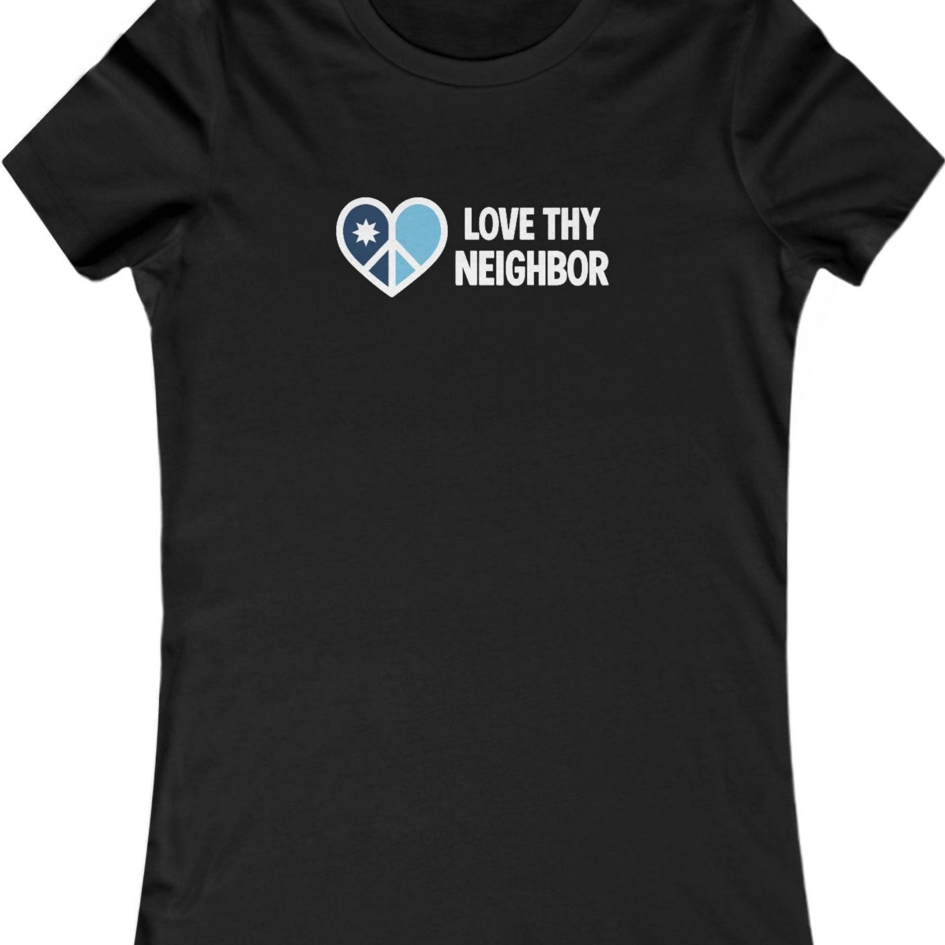 This women’s Minnesota t shirt centers care, peace, and place. The design reads Love They Neighbor. A peace sign heart holds the Minnesota flag. Clear message. Minnesota rooted.