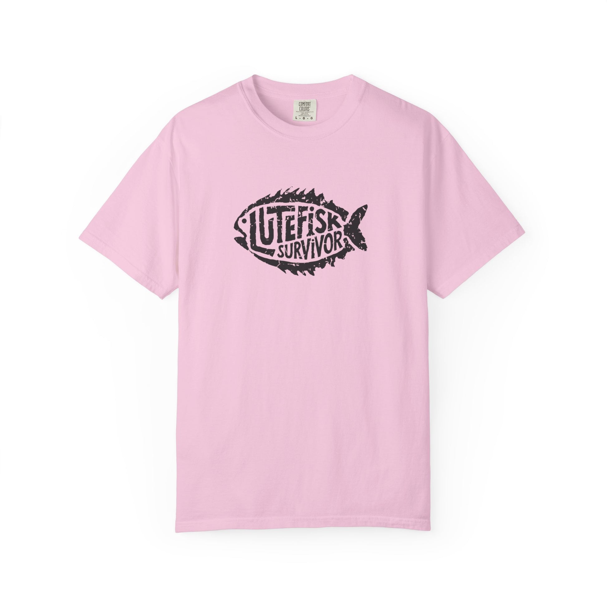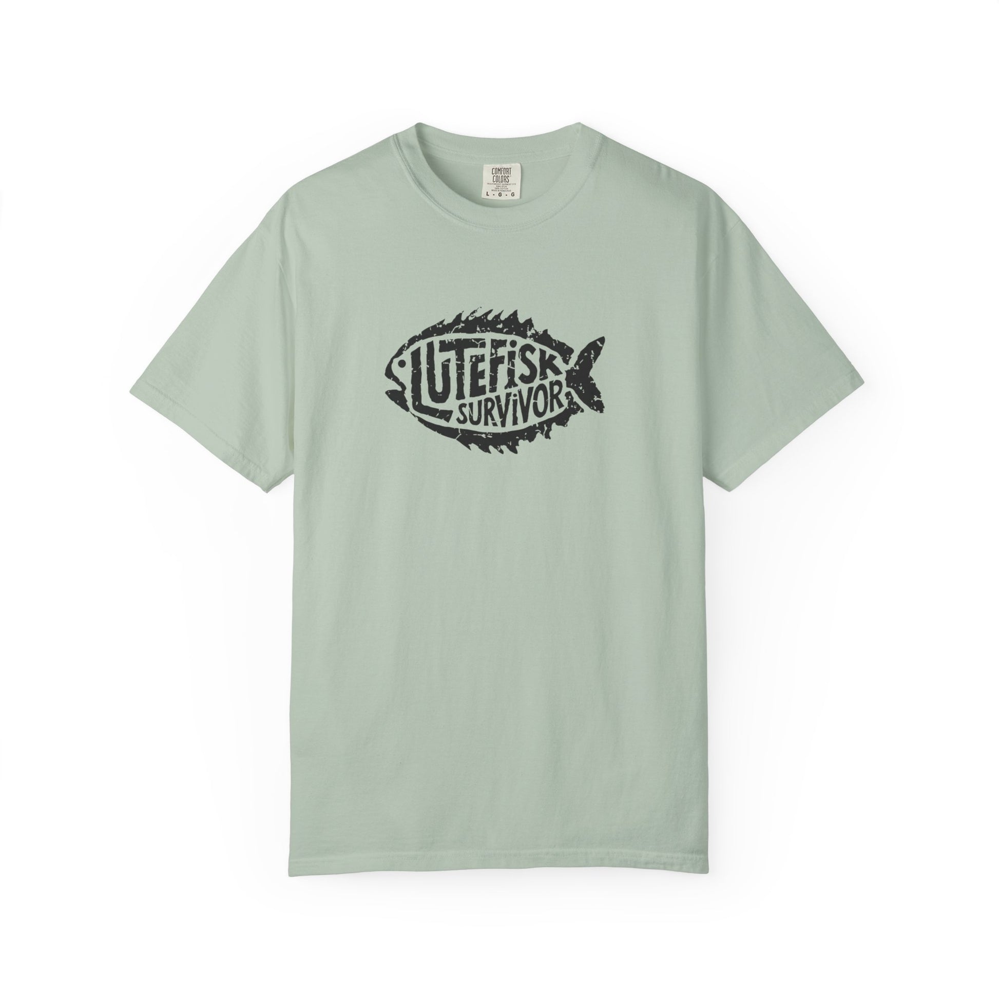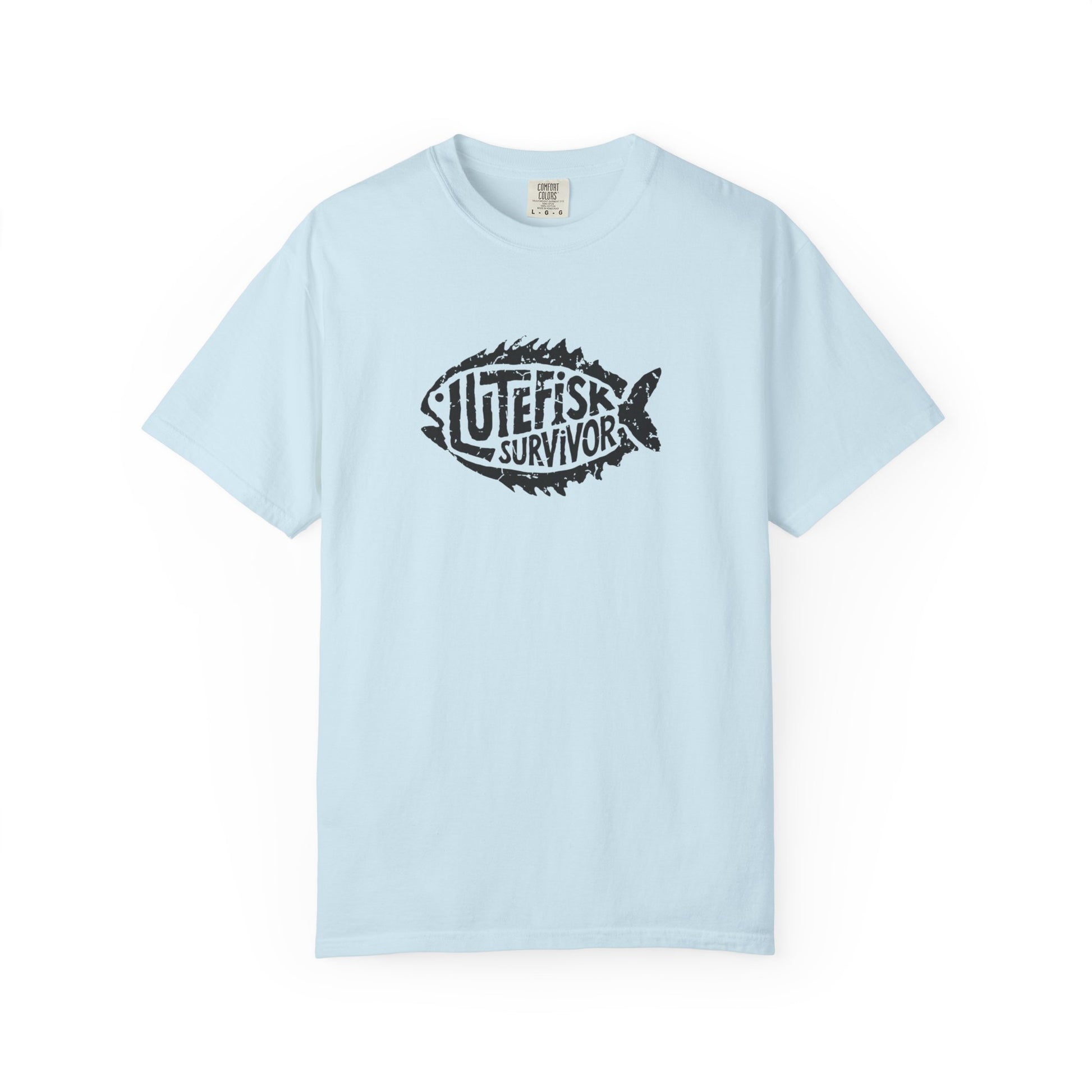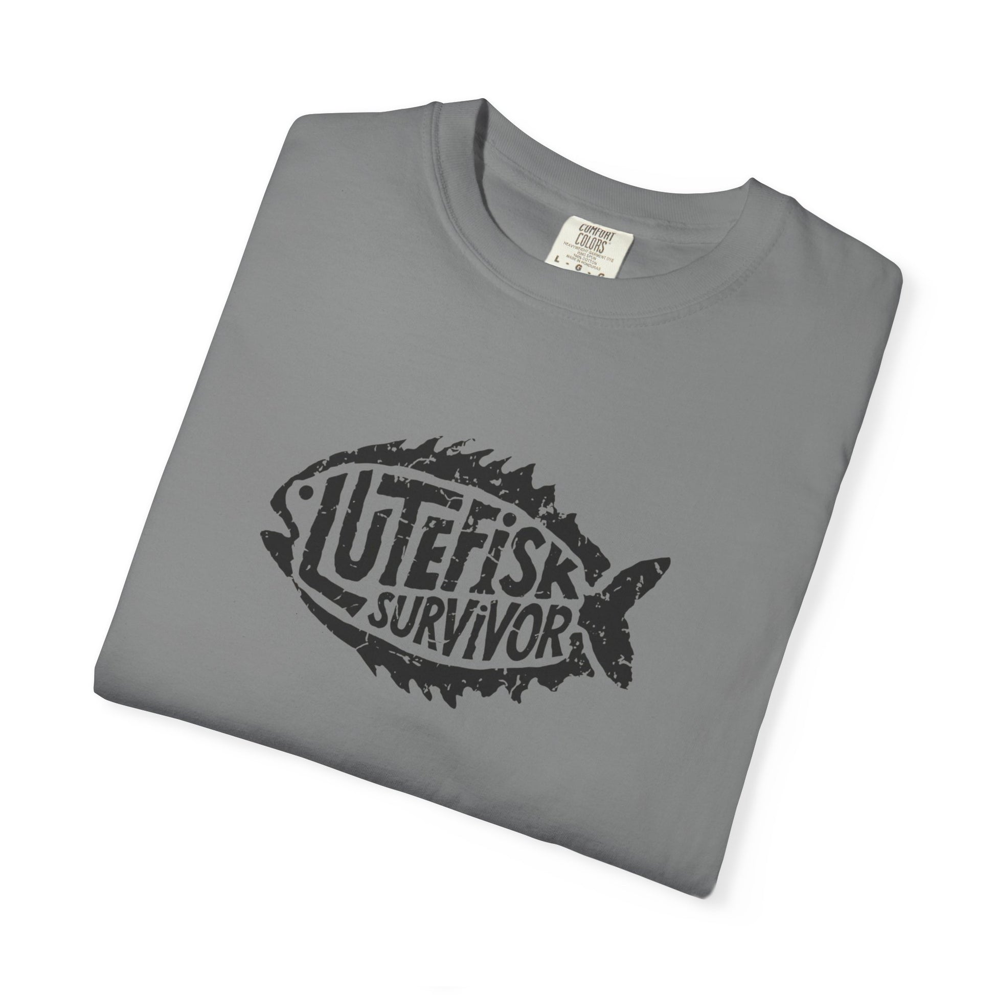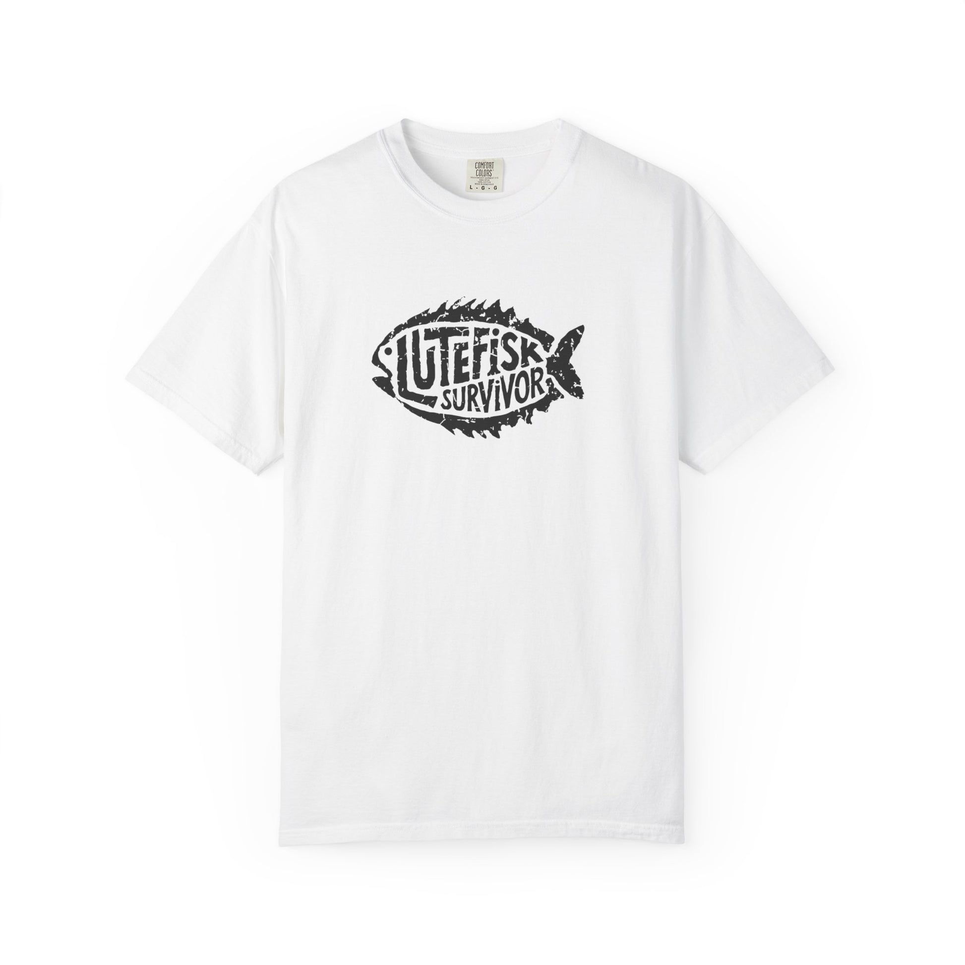 A humorous and quirky T-shirt that proudly declares the wearer as a 'Lutefisk Survivor'. Perfect for those who enjoy unique and funny clothing, this T-shirt gives off a playful and lighthearted vibe. Ideal for anyone who appreciates Scandinavian humor or wants to stand out with a witty statement piece. Great for wearing to casual gatherings, parties, or as a conversation starter at social events. Suitable for adults with a good sense of humor.Â