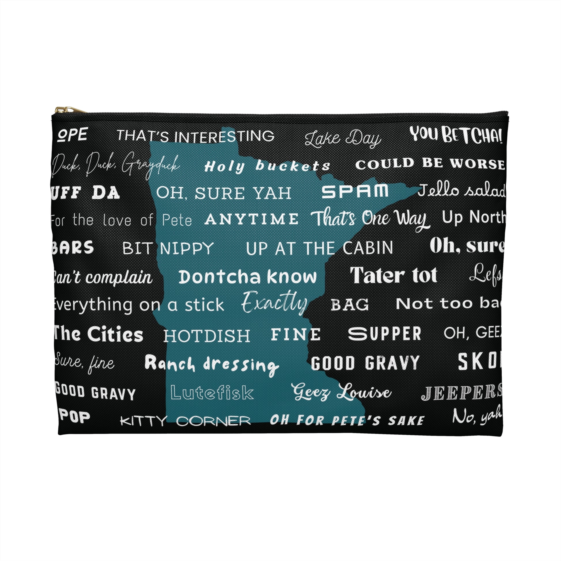 Oh, you betcha this bag is something special! Ope, just let me tell you about this roomy organizer covered in all your favorite Minnesota sayings - from "Uff da" to "Duck duck gray duck" and everything in between. Perfect for hauling your essentials up to the cabin, storing your State Fair finds, or just keeping your life together (because we're nothing if not prepared, dontcha know).